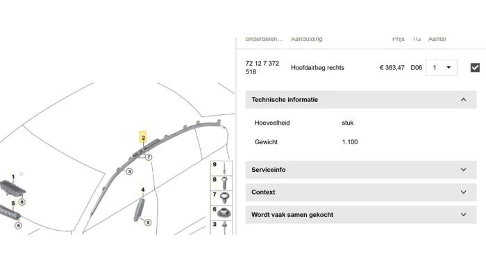 Bent u op zoek naar een betrouwbaar en kwalitatief Airbag hemel rechts van het merk BMW? Dan hoeft u niet verder te zoeken. Wij beschikken over een ruime selectie die geschikt zijn voor diverse automerken en -modellen. Kunt u het juiste onderdeel niet vinden of twijfelt u of het past bij uw auto? Neem dan gerust contact met ons op via onderstaande contactgegevens. Wij helpen u graag verder.
